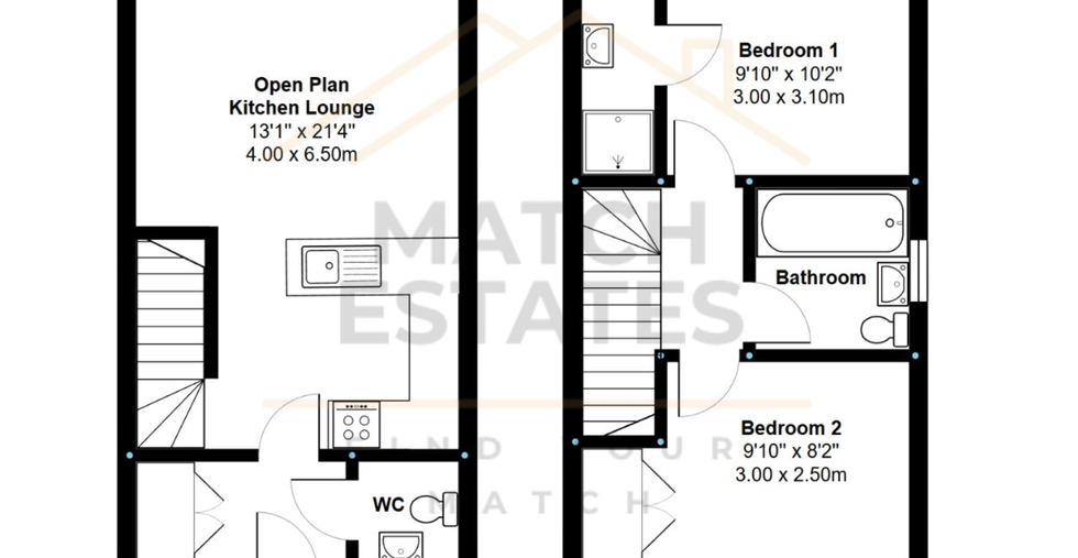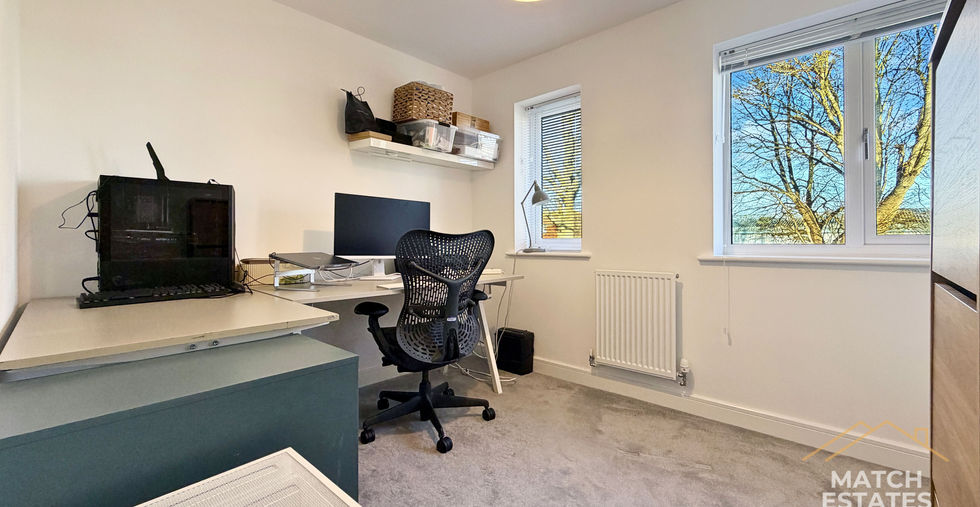 Upstairs, the accommodation continues with two well-proportioned bedrooms with built in furniture, both offering a calm and comfortable retreat. The main bedroom sits to the front of the property, while the second bedroom works equally well as a guest room, home office or nursery. A stylish family bathroom serves the upper floor, finished to a modern standard in keeping with the rest of the home.